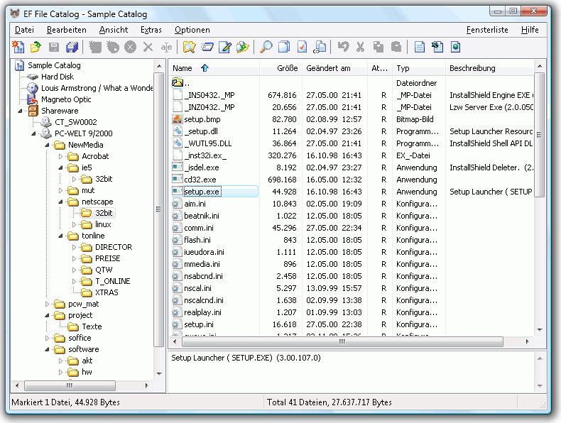 EF File Catalog ist eine komplexe und benutzerfreundliche Katalogsoftware mit vielen Extras. Das Programm liest den Inhalt von Wechseldatenträgern oder von Ordnerstrukturen auf Ihrer Festplatte und speichert Informationen über die enthaltenen Dateien in Form spezieller Katalogdateien. Einmal eingelesen, können Sie später auf die gespeicherten Dateiinformationen der katalogisierten Medien zugreifen, ohne dazu die entsprechenden Datenträger einlegen zu müssen. Auf Wunsch können während des Einlesevorgangs auch Archivdateien aller gebräuchlichen Formate durchsucht und deren Inhalte katalogisiert werden.